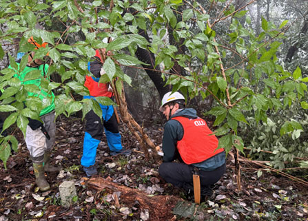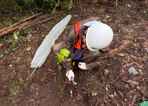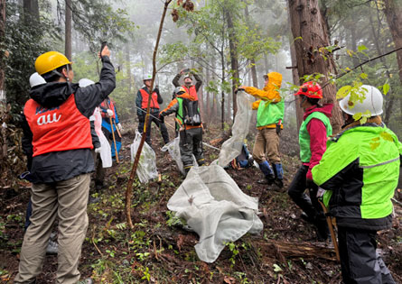 雨天の中、ヤマザクラ・カツラ・ケヤキ・ムクノキ・エノキ・オオモミジの6種計250本のポット苗の植樹と、獣害対策用ネット巻き、常緑広葉樹や、下層植生といった中低木や高木幼樹の生育を妨げる灌木類の除伐作業を実施しました。