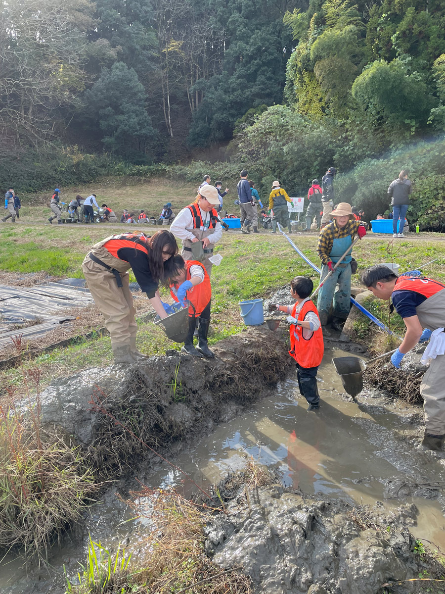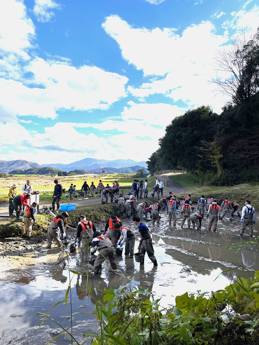 注3)の堆積物を排出し、さらにウシガエルのオタマジャクシやアメリカザリガニをバケツ1杯分駆除することができました。豊岡市コウノトリ共生課の宮垣課長からは、「在来種の生息に適した環境に一歩近づいた」というお言葉をいただきました。