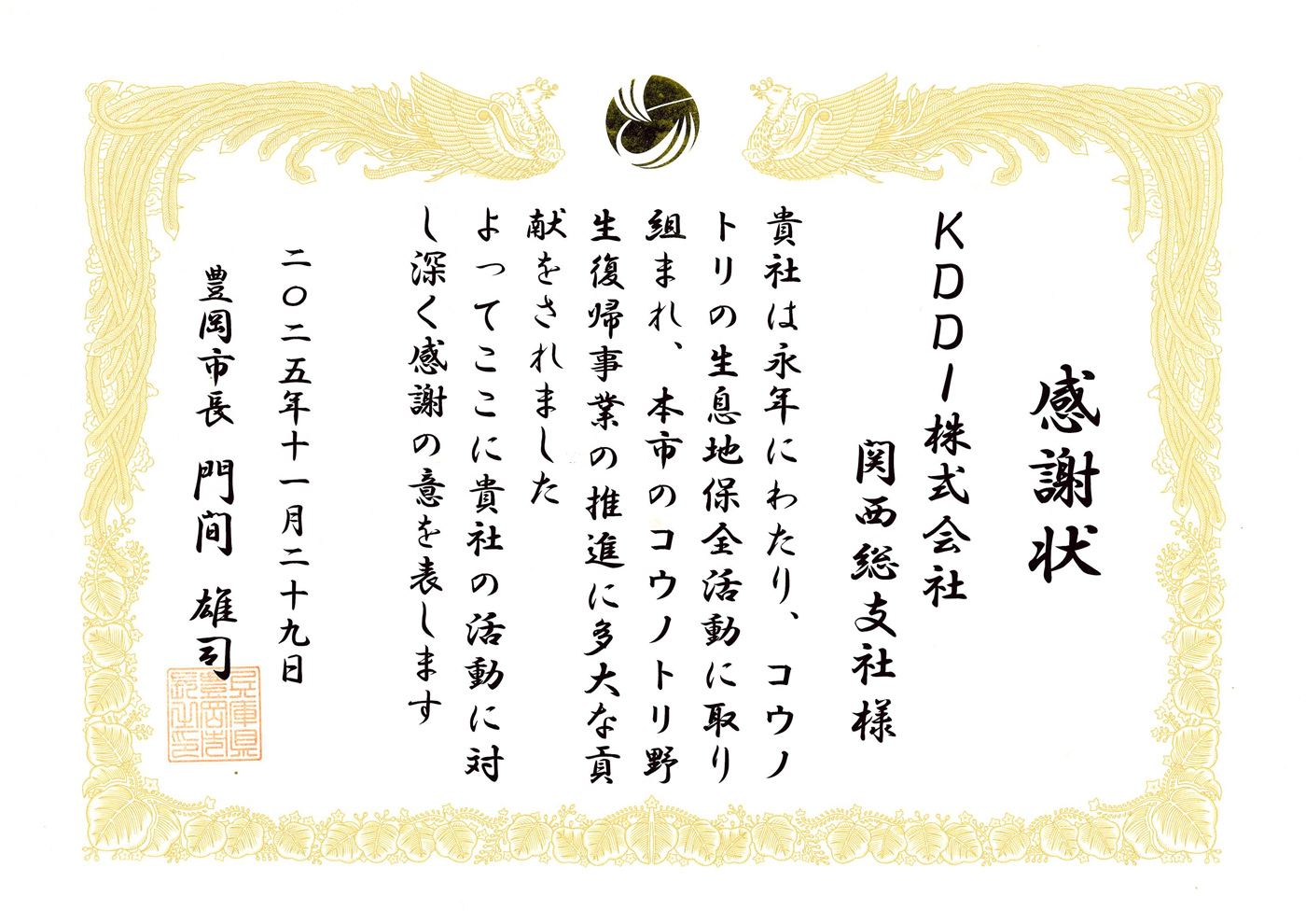 今年は、その放鳥20周年を記念し、豊岡市立コウノトリ文化館での開会式後、中筋コミュニティセンターにおいて、豊岡市の門間市長から当社の9年間の取り組みに対して感謝状をいただきました。