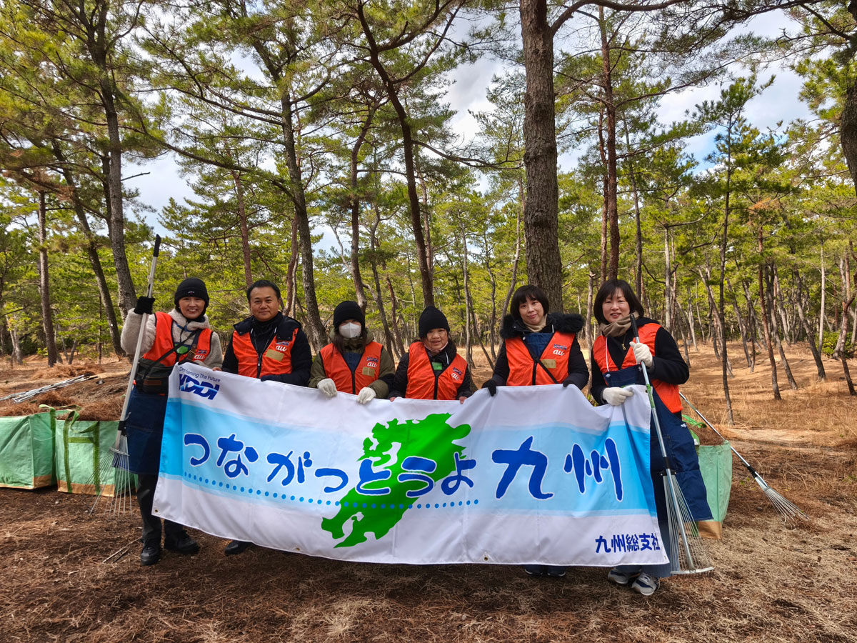 KDDIは2026年2月8日、福岡県にある国営海の中道海浜公園にて開催された、特定非営利活動法人グリーンシティ福岡主催の「まつばら楽校」(国営海の中道海浜公園主催)内の展示「松葉の炭づくり」に、KDDIから6名のボランティアが参加しました。当日は気温0度と寒い日でしたが、松原に入ると風がなくなり、防風林のありがたさを痛感しました。