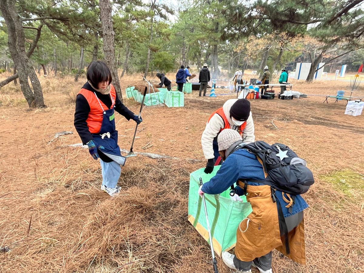 江戸時代に植樹が始まり、多くの先人たちが大切に育ててきた松原は、今、松枯れの影響で少しずつ失われつつあります。松原がなくなると、潮風や砂の影響で住宅や田畑が被害を受ける恐れがあります。そのため、枯れた枝を拾い、松葉をかいたりすることで、松原の健全な状態を保ち、美しい白砂青松の風景を守ることができます。