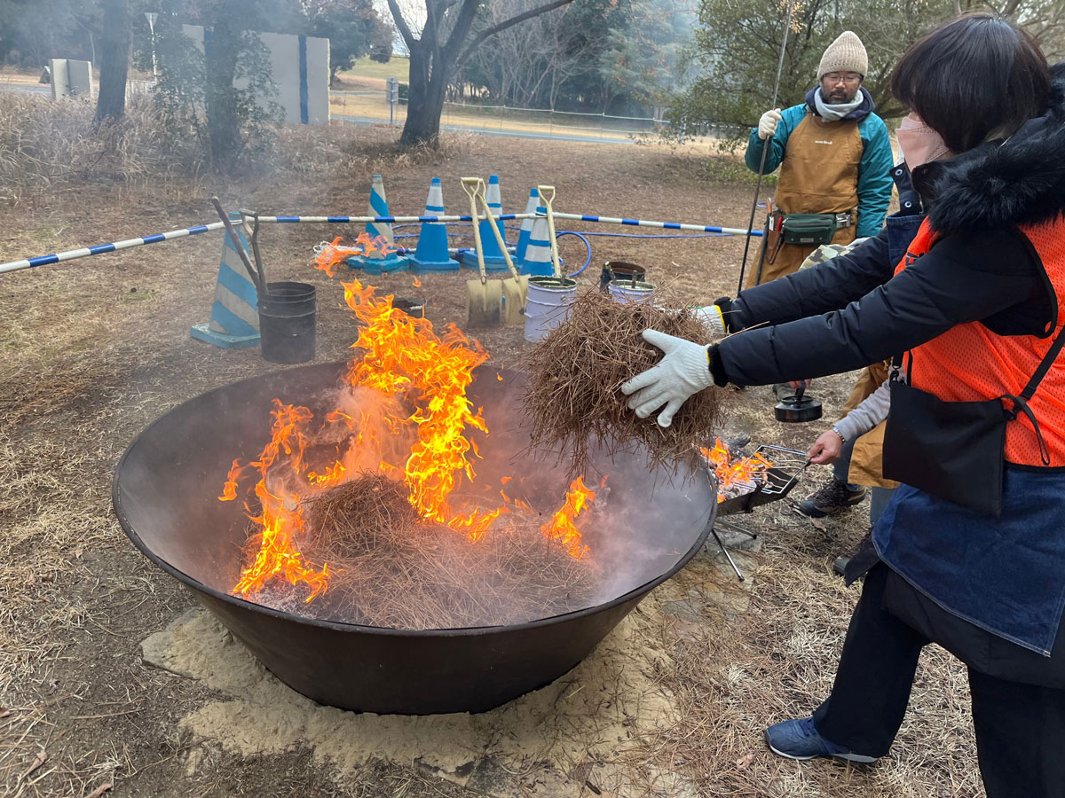 <松葉を投入して炭作り※特別な許可を得て実施>